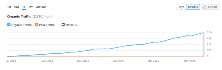 The metrics below show a steady increase in traffic, growing from 0 in July 2024 to 2,530 in June 2025, with an average monthly growth rate of 44.4%. With a 4% conversion rate, this translates to approximately 101 inquiries in June 2025, highlighting strong momentum over the past year.
